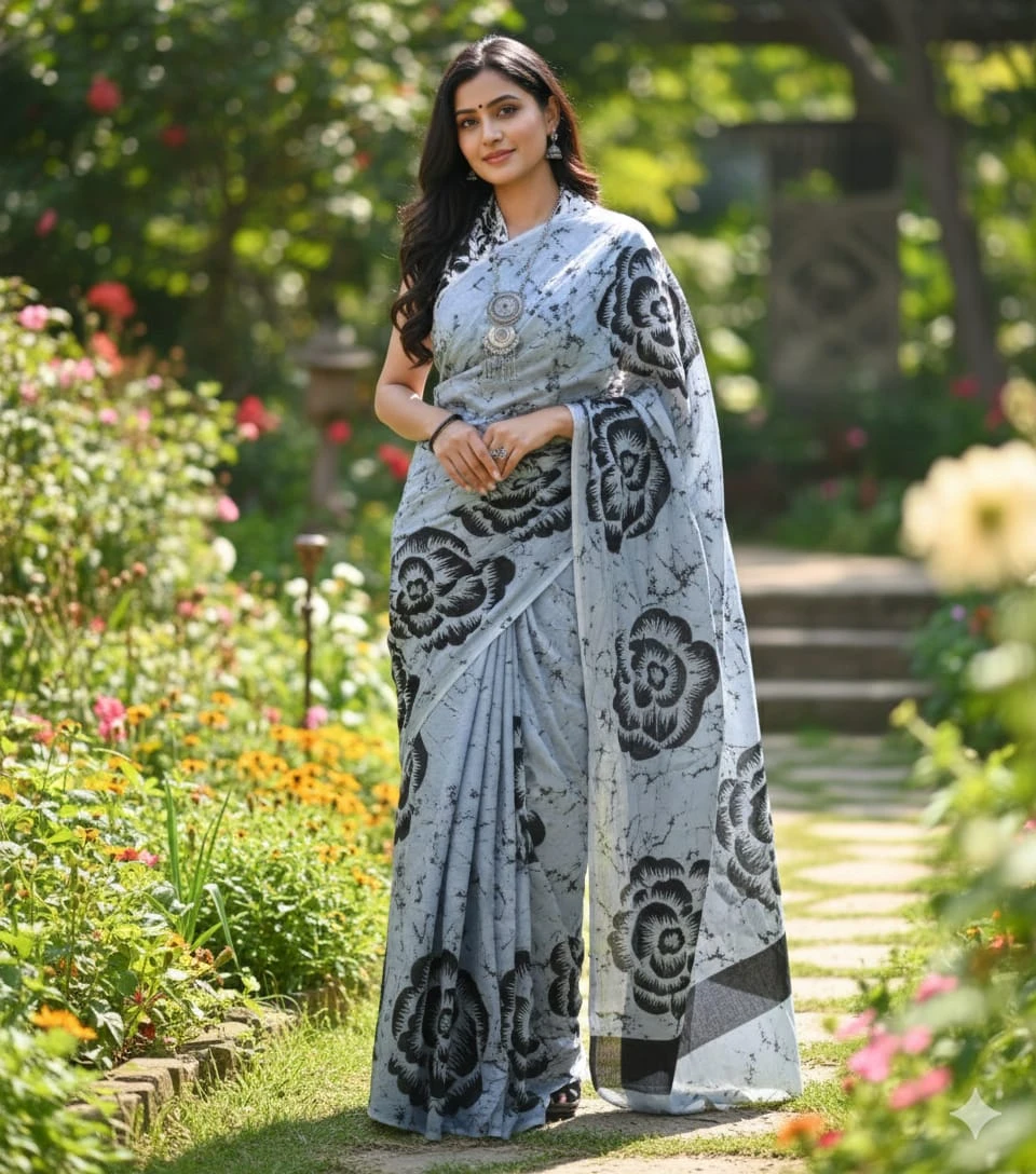 The subtle textures and natural prints give this saree a graceful appeal that never goes out of style. Pair it with minimal jewelry for an effortless ethnic look.
