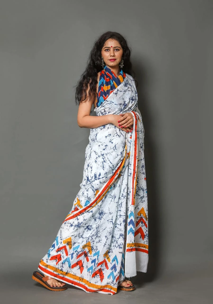BHEZOO ki yeh premium Pure Mulmul Cotton Saree traditional Bagru-inspired block print ke saath aati hai, jo comfort aur ethnic elegance ka perfect combination hai।